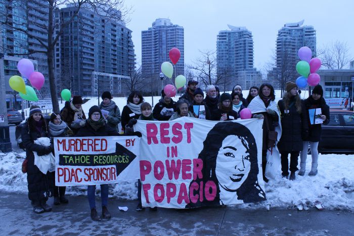 Este pasado domingo, miembros del grupo Red Contra la Minería Injusta (MISN por sus siglas en inglés), se tomaron las calles de Toronto, dándole la bienvenida a los invitados de la Asociación de Empresas de Exploración y Desarrollo Minero (PDAC por sus siglas en inglés), a la “Convención empresarial, colonial, supervillana más grande del mundo”.