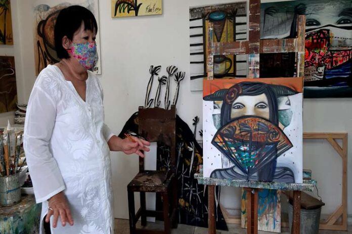 La artista cubana de la plástica Flora Fong crea hoy una nueva serie pictórica denominada ‘Nasobuqueñas’, tributo de colores y abanicos a la mujer cotidiana y reflejo del dramatismo de los momentos actuales.