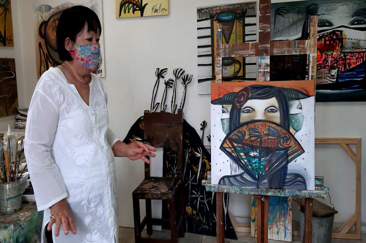 ‘Como artista no podía eludir esa realidad. Empecé por un cuadro pequeño, luego el nasobuco se transformó en abanico y reveló el diapasón del paisaje cubano. En ese adorno puede aparecer un momento crepuscular o una noche estrellada. Igualmente sustituye, de manera artística, al cubrebocas’, afirmó la pintora.
