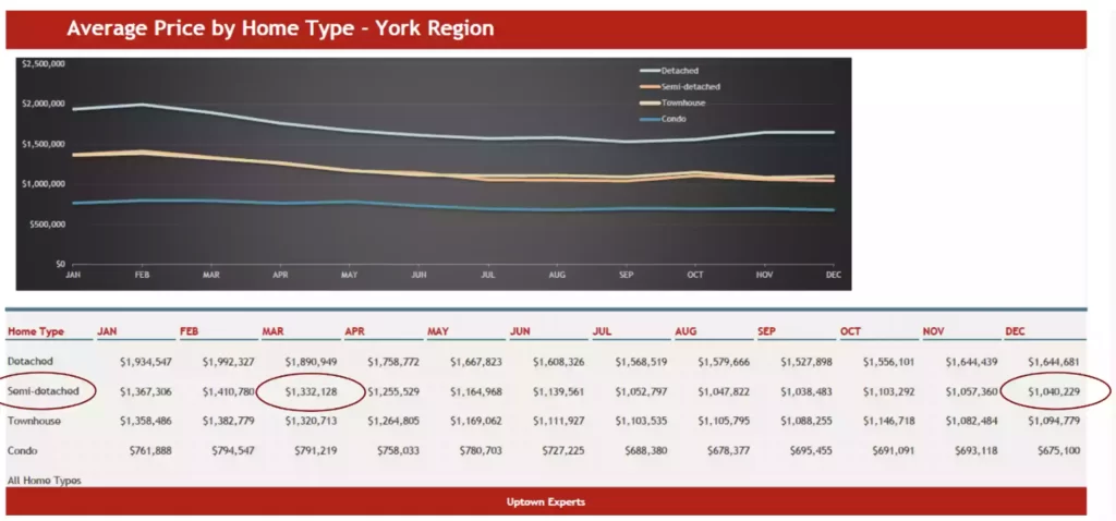 Desde febrero del 2022 hasta ahora, hemos visto cómo los precios de las propiedades han bajado mientras las tazas de intereses de hipotecas subieron. El siguiente gráfico tomado de la Junta Regional de Bienes Raíces de Toronto, que tanto han caído los precios de propiedades, siendo los condominios los que menos valor han perdido con respecto a otros tipos de viviendas.