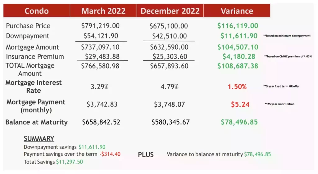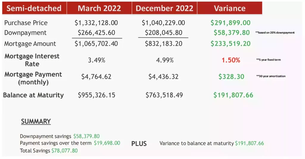 Ahora, tomemos como ejemplo una propiedad semi-detached que en febrero 2022 llego a valer por arriba de los 1.3 millones y que en diciembre del mismo año bajo en precio a solo estar por arriba de 1 millón. Si analizamos la siguiente foto, podemos ver como ahora se está ahorrando más de 58K en el downpayment. El valor de la hipoteca que necesitas para comprar la misma casa es mucho menor. Lo que hace que a pesar de que los intereses subieron, el pago mensual ha disminuido. El balance final de la hipoteca al final de los 5 años también es mucho menor.