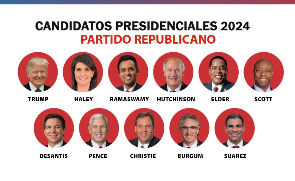 La amplia lista la encabezan figuras muy conocidas como el expresidente Donald Trump y el gobernador de Florida, Ron DeSantis, quienes aparecen como los dos contendientes con más posibilidades de imponerse en los comicios primarios de la formación roja.