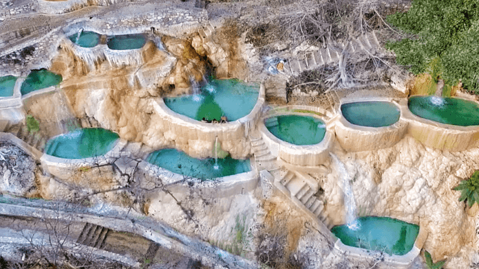 Las pozas de Tolantongo son unas 40 terrazas situadas en el inclinado acantilado donde se acumula el agua proveniente del río que fluye por las grutas, cada una independiente del resto, lo que permite disfrutar un relajante baño de aguas termales en las alturas.