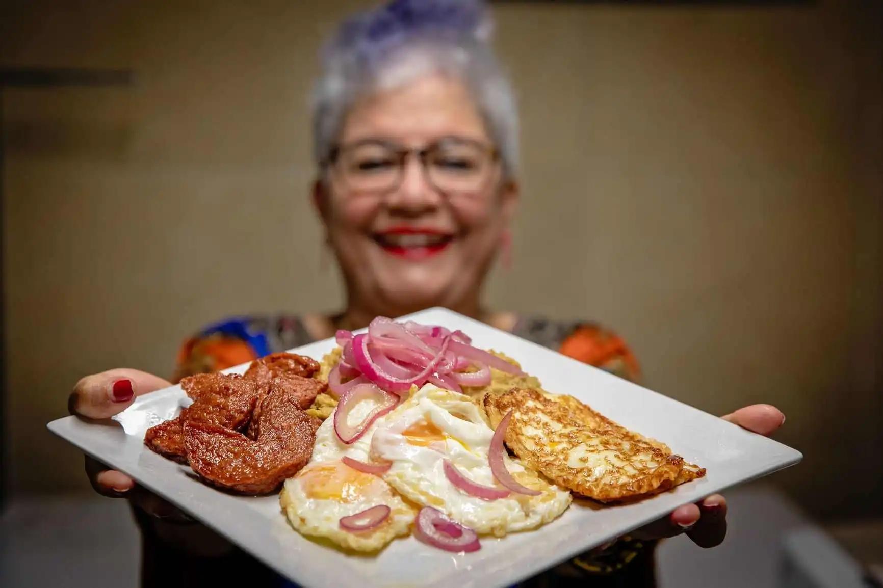 Una de las delicias de la culinaria dominicana más arraigada en la población es el mangú, un puré de plátano verde acompañado de salami, queso blanco frito y huevo.