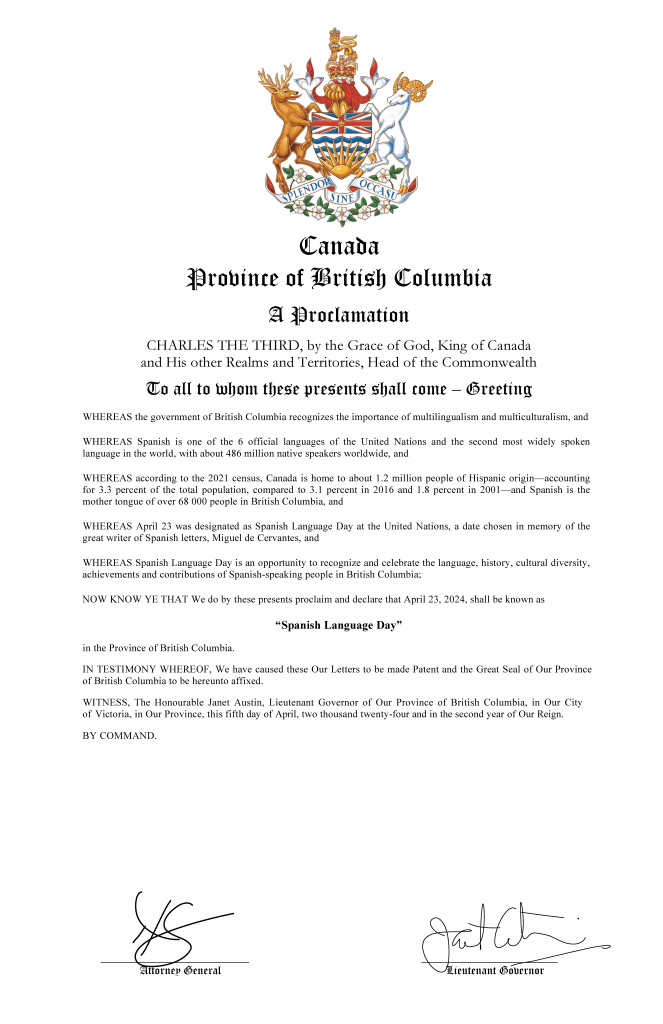 Destaca igualmente la proclamación del Día del idioma Español por parte de la provincia de British Columbia, en la cual se reconoce la importancia del multilingüismo y la multiculturidad. En la proclama resalta que el idioma es la segunda lengua más hablada en el mundo, que en Canadá residen más de 1.2 millones de migrantes de origen hispano; y que en esa provincia hay más de 68 mil personas cuya lengua nativa es el español. Este documento fue suscrito por la gobernadora provincial y refrendado por el Rey Carlos III.