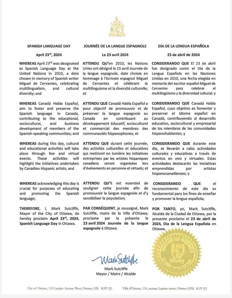 Recientemente, la ciudad de Ottawa también se sumó a esta iniciativa y emitió la proclamación del Día de la Lengua Española en tres idiomas (inglés, francés y español) como una manera de “celebrar el multilingüismo y la diversidad cultural” de los hispanohablantes.