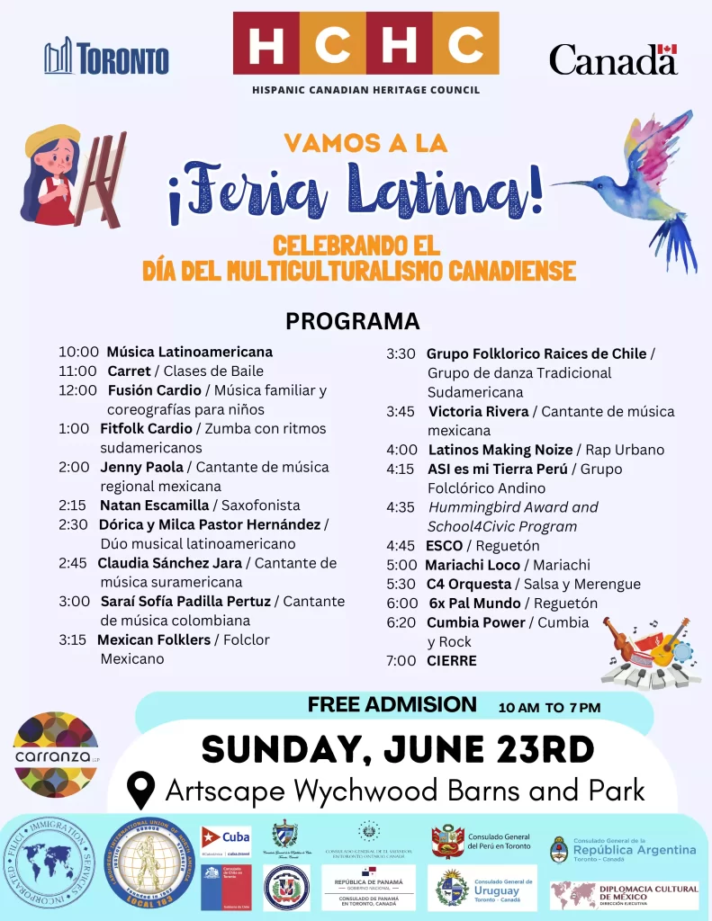A propósito de ello, resalta la iniciativa del Consejo de la Herencia Hispana (HCHC) de celebrar la 5ta edición de la Feria Latina, el próximo domingo 23 de junio, en los espacios de Artscape Wichwood Barns and Park, ubicado en la zona de St. Clair y Christie (601 Christie St.), considerado el corazón latino de Toronto por los numerosos negocios y la gran población latinoamericana que se ubica en esta área.