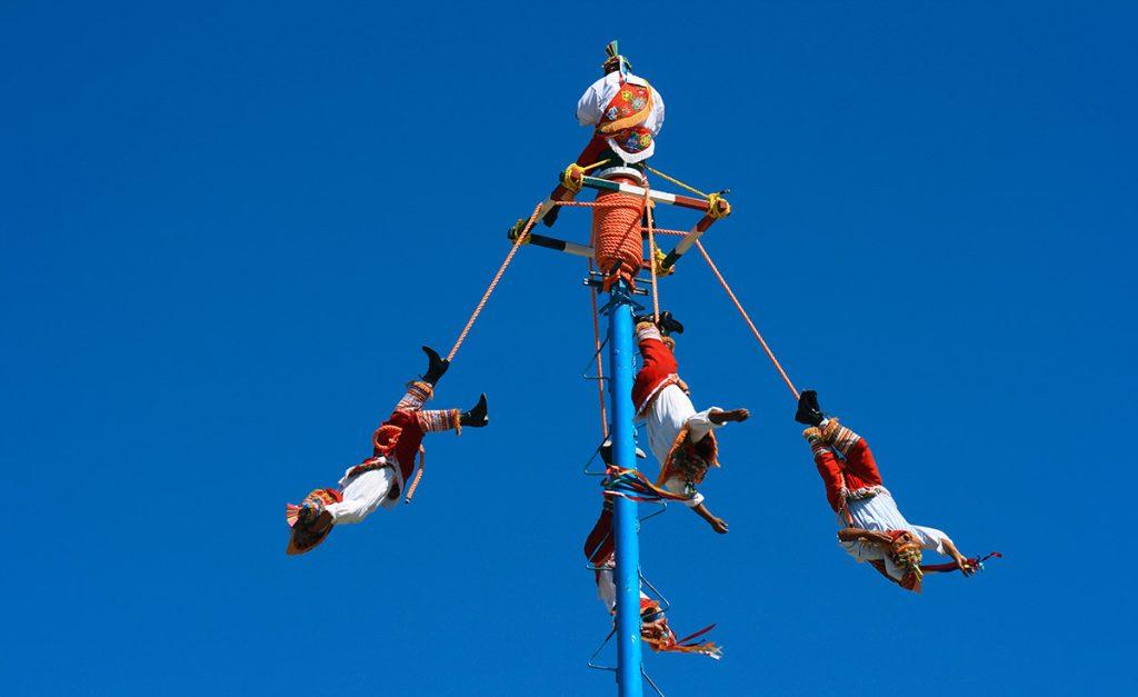 Desde las alturas, los danzantes se lanzan al vacío con una sincronía perfecta, girando lentamente mientras sus cuerpos suspendidos danzan en el aire, atados únicamente por cuerdas que sostienen su valentía.