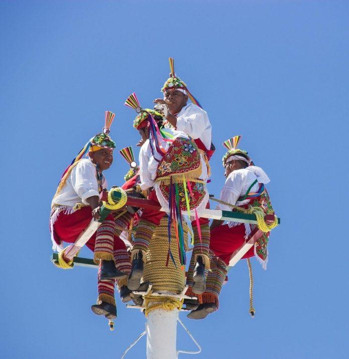 Desde las alturas, los danzantes se lanzan al vacío con una sincronía perfecta, girando lentamente mientras sus cuerpos suspendidos danzan en el aire, atados únicamente por cuerdas que sostienen su valentía.