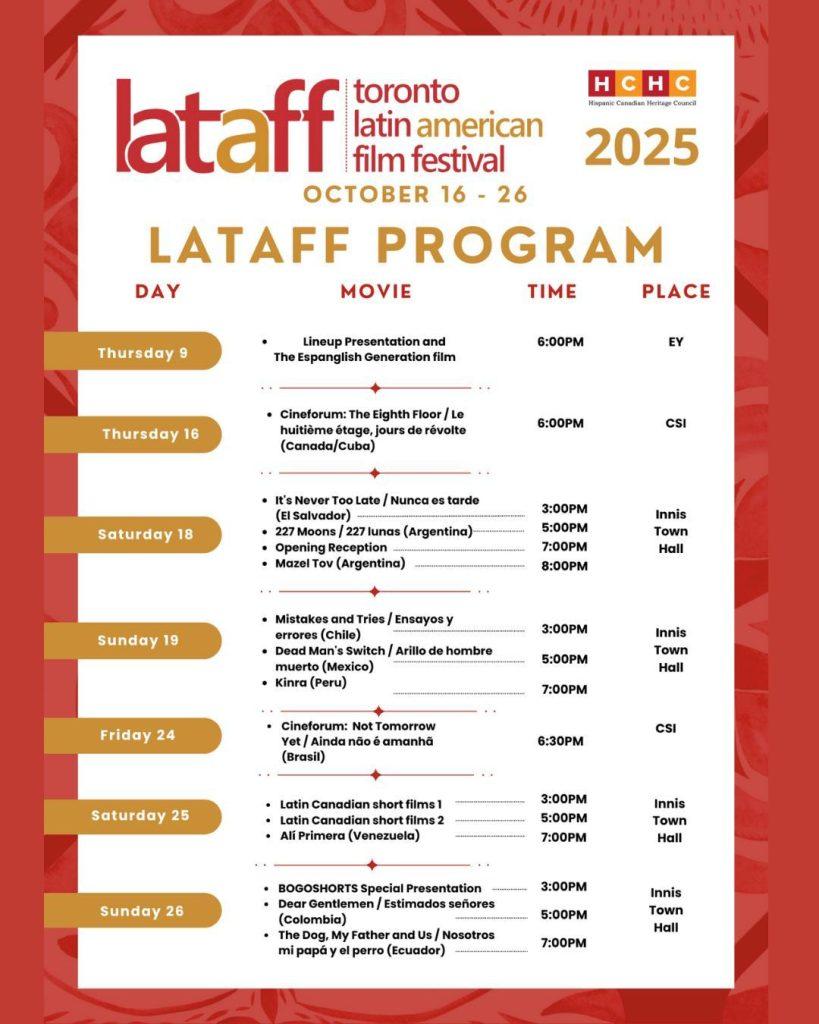 El Consejo Canadiense para la Herencia Hispana (HCHC) invita a todos los amantes del cine a disfrutar el cine hispano-latinoamericano en la décima edición del Toronto Latin American Film Festival (LATAFF) 2025. Usted puede ver la programación completa y comprar sus boletos en www.lataff.ca
