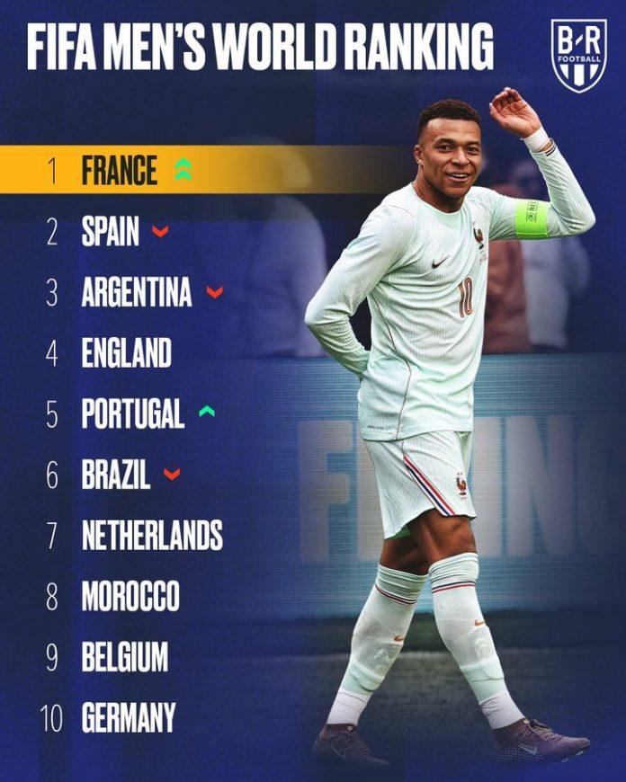 Con una diferencia de 0,92 puntos Francia recuperó el primer lugar del Ranking FIFA. Durante su gira por Estados Unidos, un récord perfecto llevó a Les Bleus al primer puesto del Ranking Mundial Masculino FIFA/Coca-Cola el miércoles 1 de abril. Francia subió dos puestos, beneficiándose del tropiezo de España —que empató 0-0 con Egipto— y superando también a Argentina, que goleó a Gambia por 5-0.